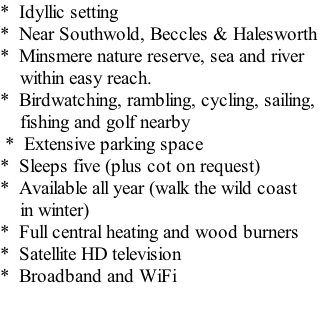 Idyllic holiday cottage with 4 acres of woodland near Southwold, Halesworth,   Minsmere and  Beccles.  Uniquely located and well equipped with great wildlife.   Enjoy bird watching at  breakfast!. Luxury cottage ideal as a base for Cycling and Walking holidays